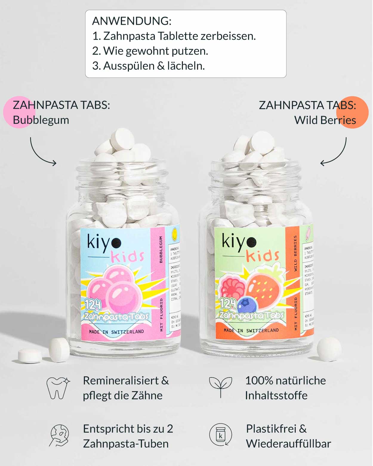 Hinter der bunten Fassade steckt eine durchdachte Rezeptur, ohne scharfes Menthol, mit schonenden Putzkörpern und nur das was die Zähne schützt & stark macht. Die Kiyo Kids Zahnpasta Tabs gibt's im Bubblegum & Wild Berries Geschmack. So wird aus dem „Putz endlich deine Zähne“ ein Selbstläufer.