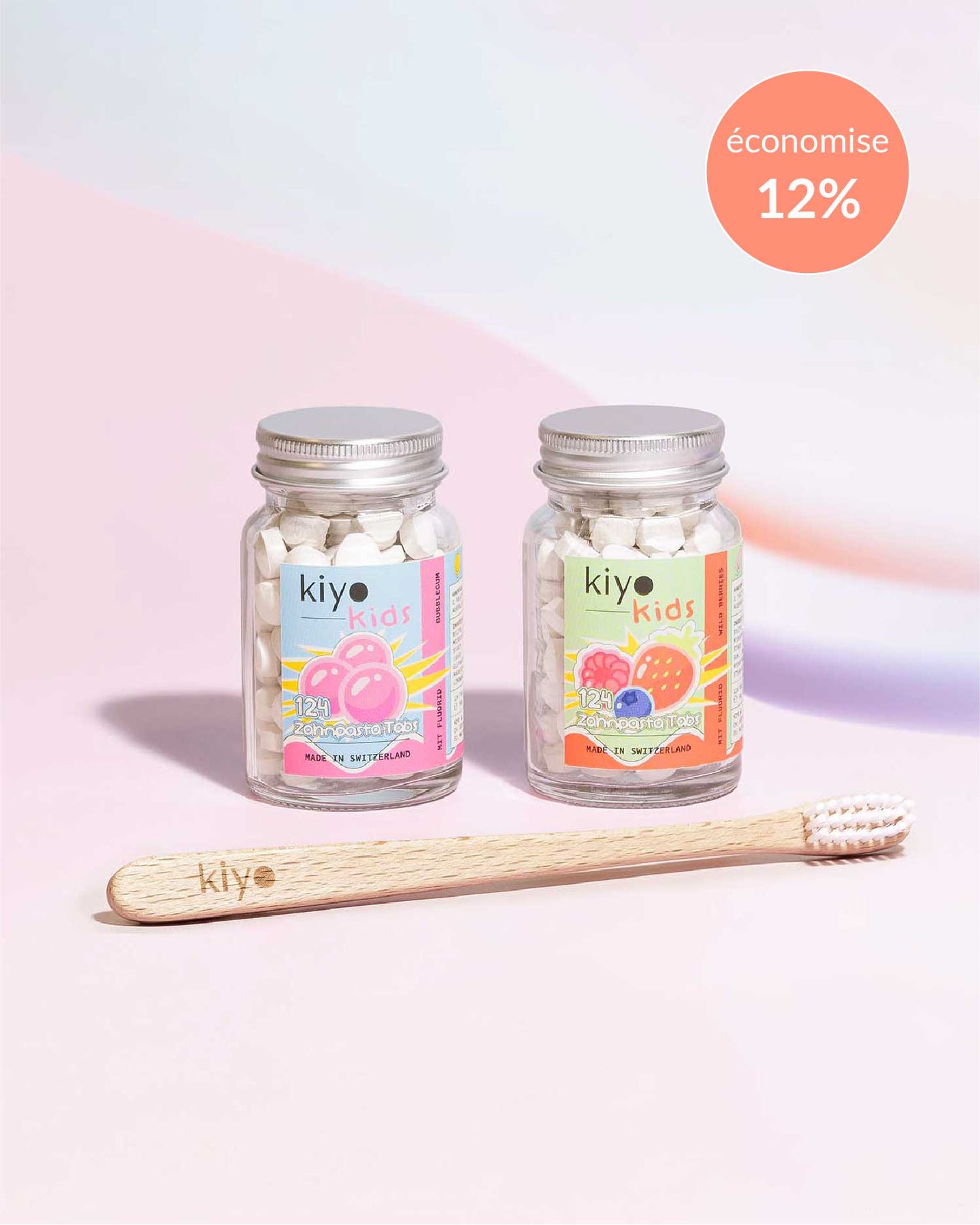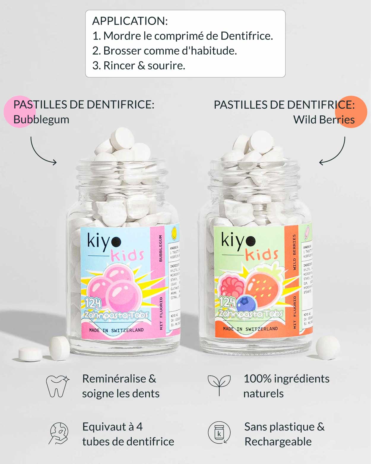 Derrière cette façade colorée se cache une formule bien pensée : sans menthol agressif, avec des agents nettoyants doux et uniquement ce qui protège et renforce les dents. Les pastilles de dentifrice Kiyo Kids existent en saveur Bubblegum & Wild Berries. Résultat : le « Va enfin te brosser les dents » devient un jeu d’enfant.